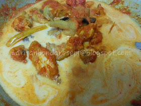 - Masukkan ayam dan bahan kisar tadi bersama cili kering dan asam keping..kacau sekali sekala bagi sebati